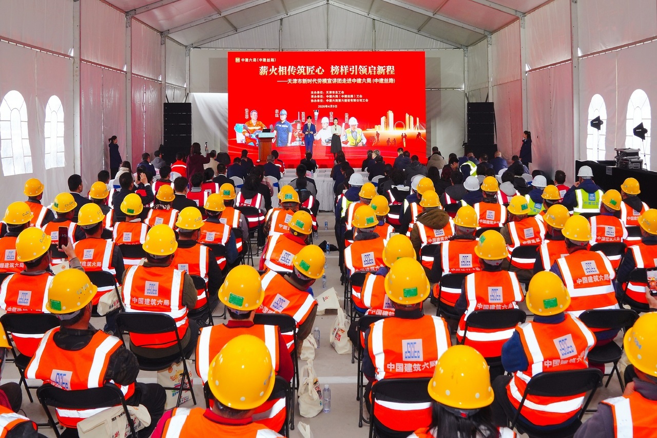 4月9日,由天津市总工会主办、中建六局(中建丝路)工会承办的“薪火相传筑匠心 榜样引领启新程”——新时代劳模工匠进工地宣讲活动在天津滨海职业学院项目工地举行,让劳模精神的“火种”在现场百余名一线建设者的心中传承。